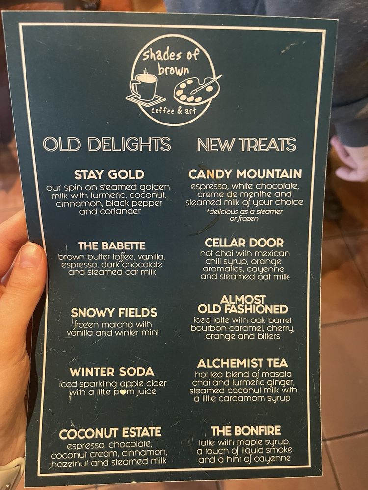 Welcome to Shades of Brown Coffee & Art, a delightful escape located at 3302 S Peoria Ave in Tulsa, OK. This coffee haven invites you to indulge in a diverse menu filled with unique beverages and artisanal treats. Signature offerings like Stay Gold and Turkish Delight promise a flavorful journey, while decadent snacks such as Tahini Brownie and Coconut Estate are perfect complements for a relaxing afternoon.